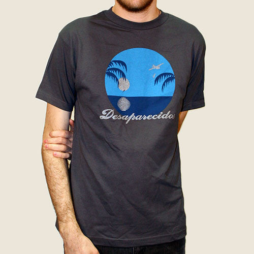 Description: Metallic silver and blue ink on a Dark Grey shirt.